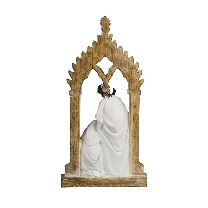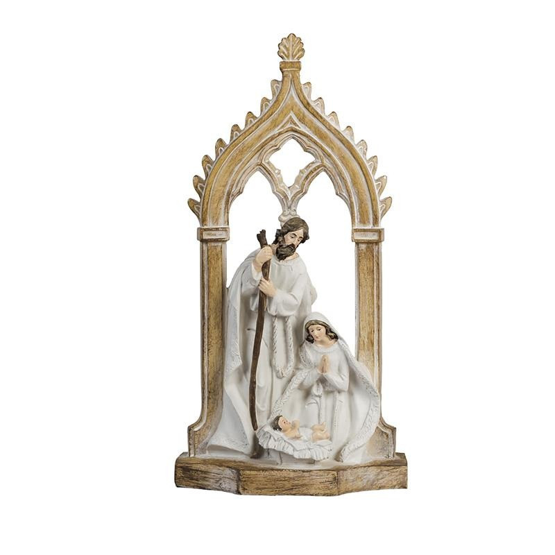 Misterio nacimiento de 1 pieza con un arco como portal de resina crema y dorado. Medidas: 25x19x43 cm