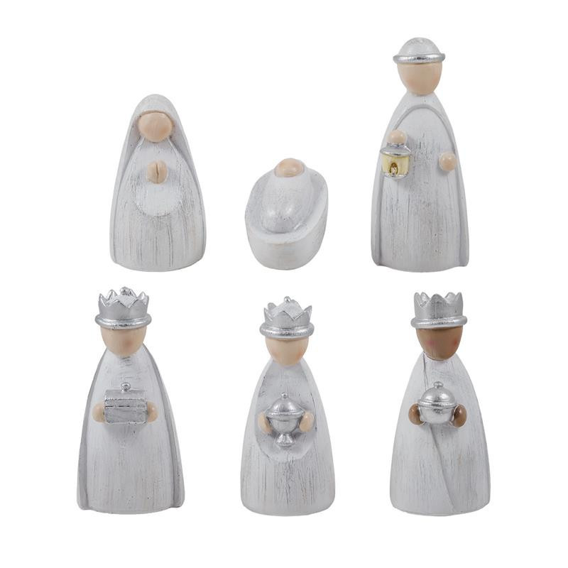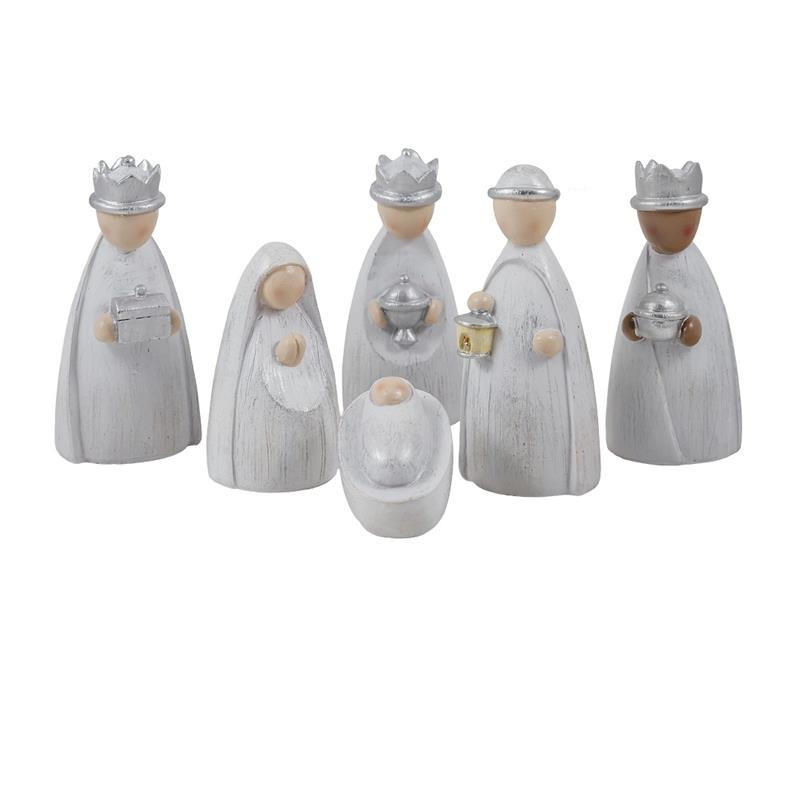 Misterio nacimiento moderno minimalista de 6 piezas sin cara blanco y plata. Medidas: 13 cm