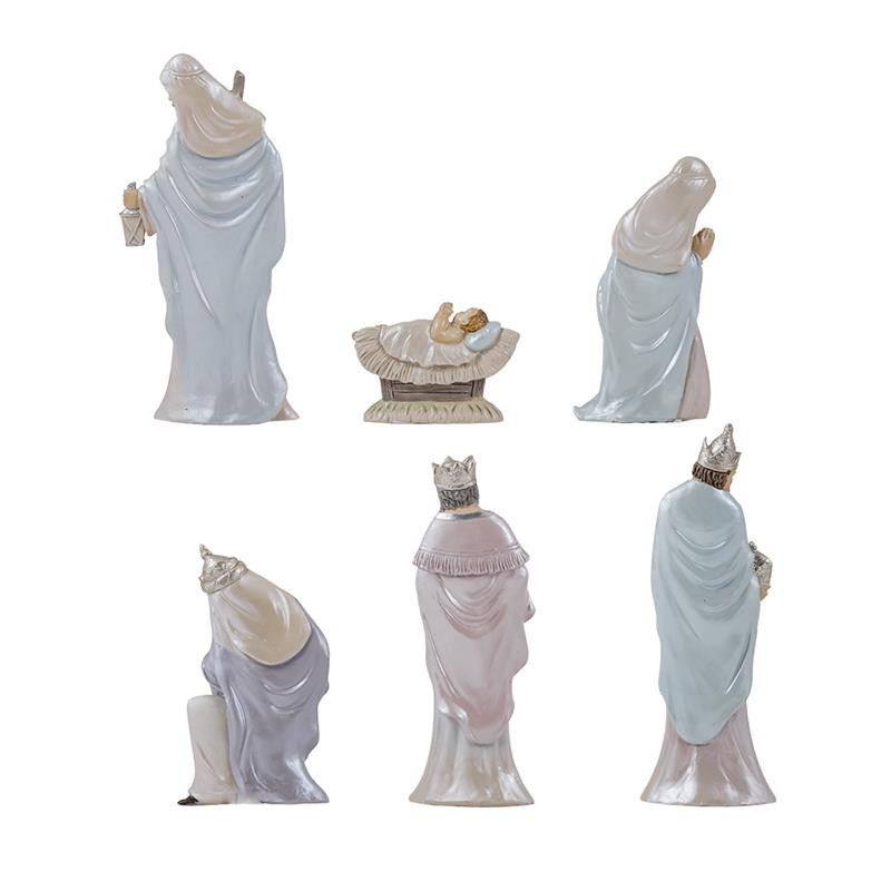 Misterio nacimiento clasico de 6 piezas tono pastel de resina pintado a mano. Medidas: 15 cm