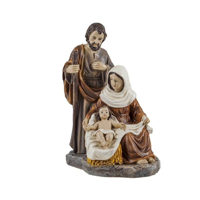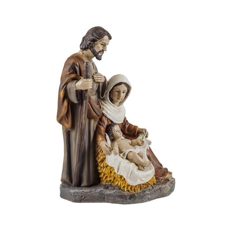 Misterio nacimiento de 1 pieza con la sagrada familia tonos ocre de resina pintado a mano. Medidas: 6x6x16 cm