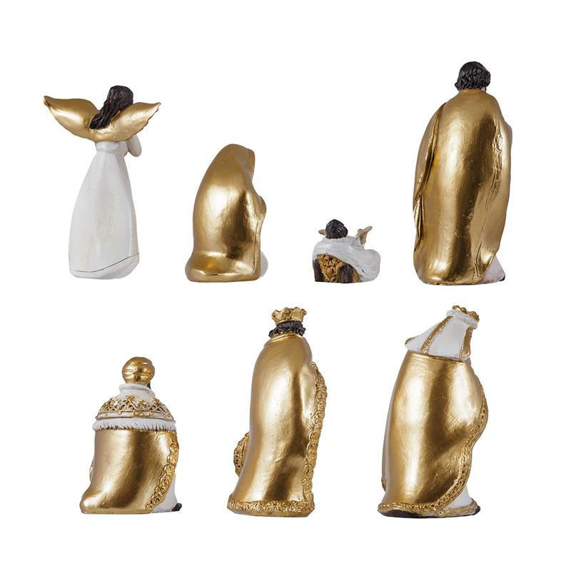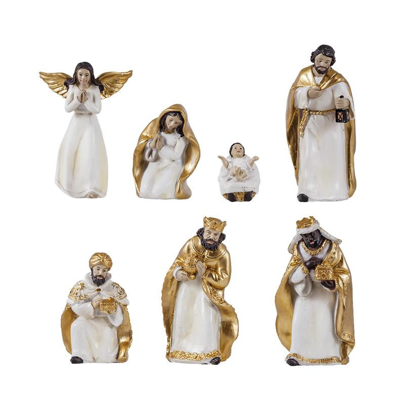 Misterio nacimiento clasico de 7 piezas crema y dorado de resina pintado a mano 10 cm