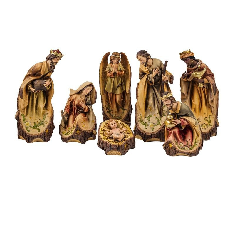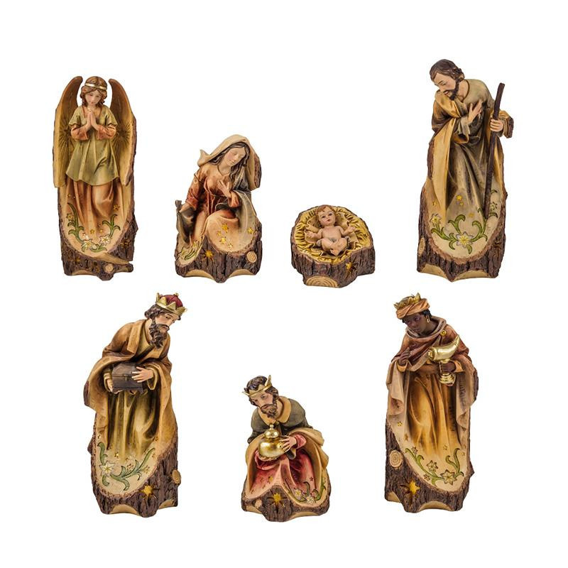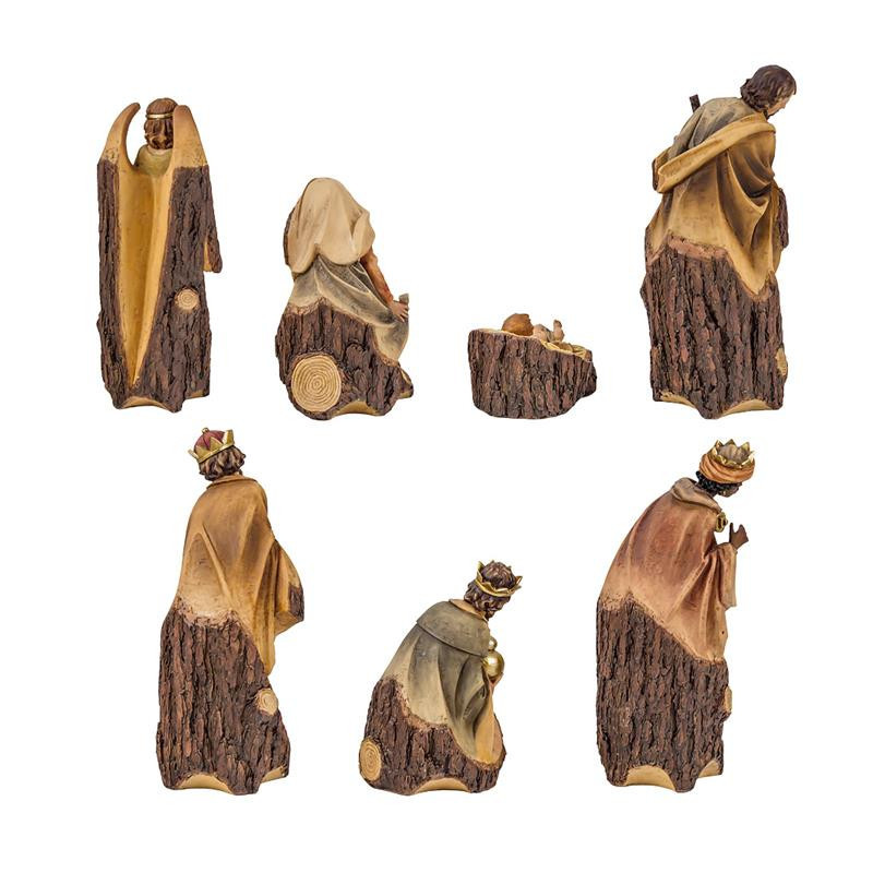 Misterio nacimiento de 7 piezas sobre troncos de resina pintado a mano 20 cm