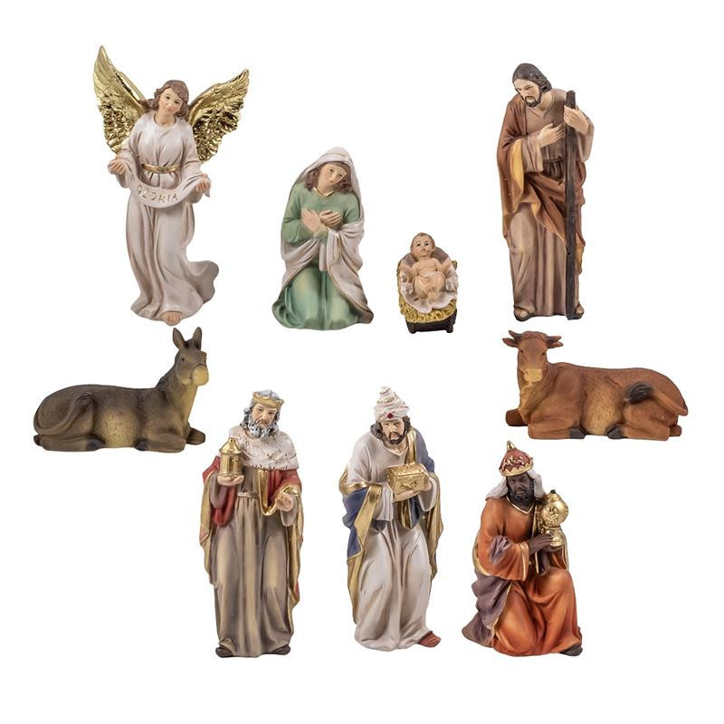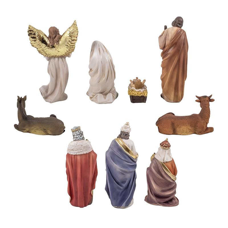 Misterio nacimiento clasico de 9 piezas de color de resina pintado a mano. Medidas: 15 cm