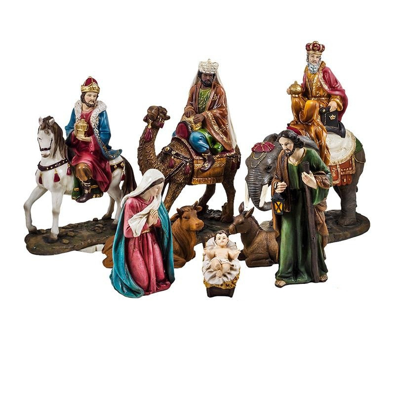 Misterio nacimiento clasico de 8 piezas con camello elefante y caballo de color de resina pintado a mano 20 cm