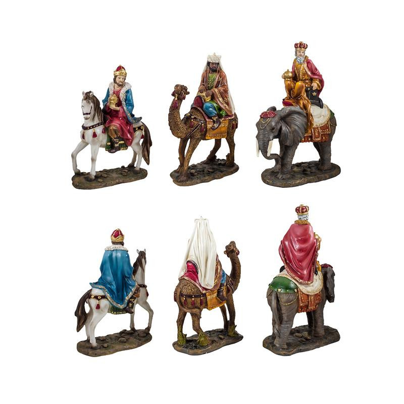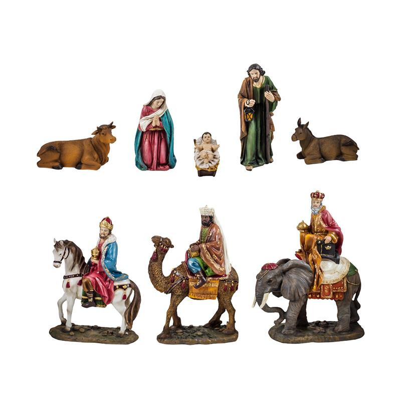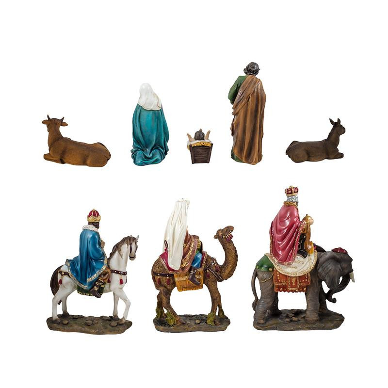 Misterio nacimiento clasico de 8 piezas con camello elefante y caballo de color de resina pintado a mano. Medidas: 20 cm