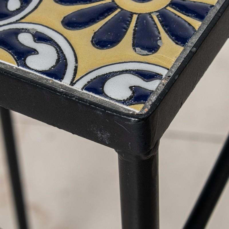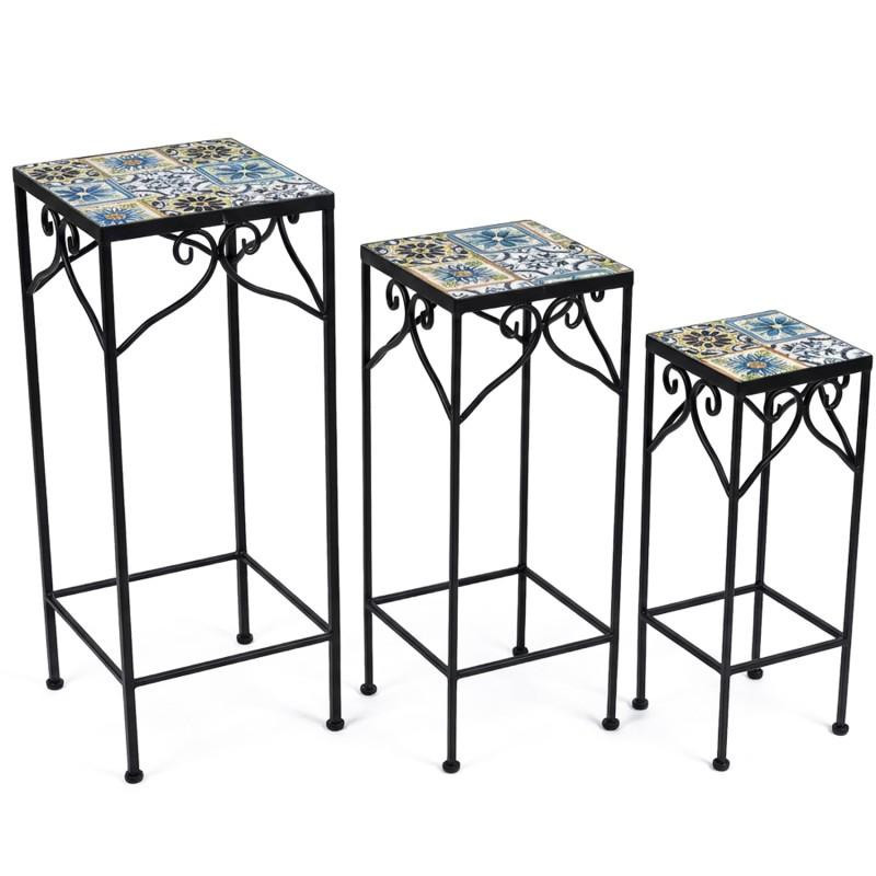 Set de 3 pedestales de metal y piedra en negro, azul y amarillo. Medidas: 28x28x70, 23x23x60 y 18x18x50cm