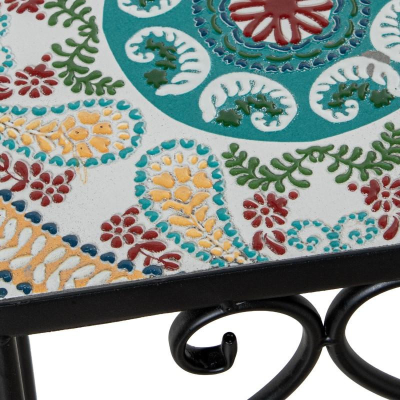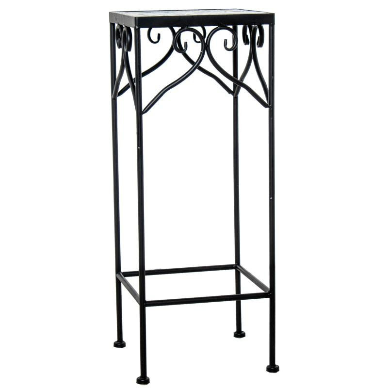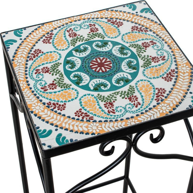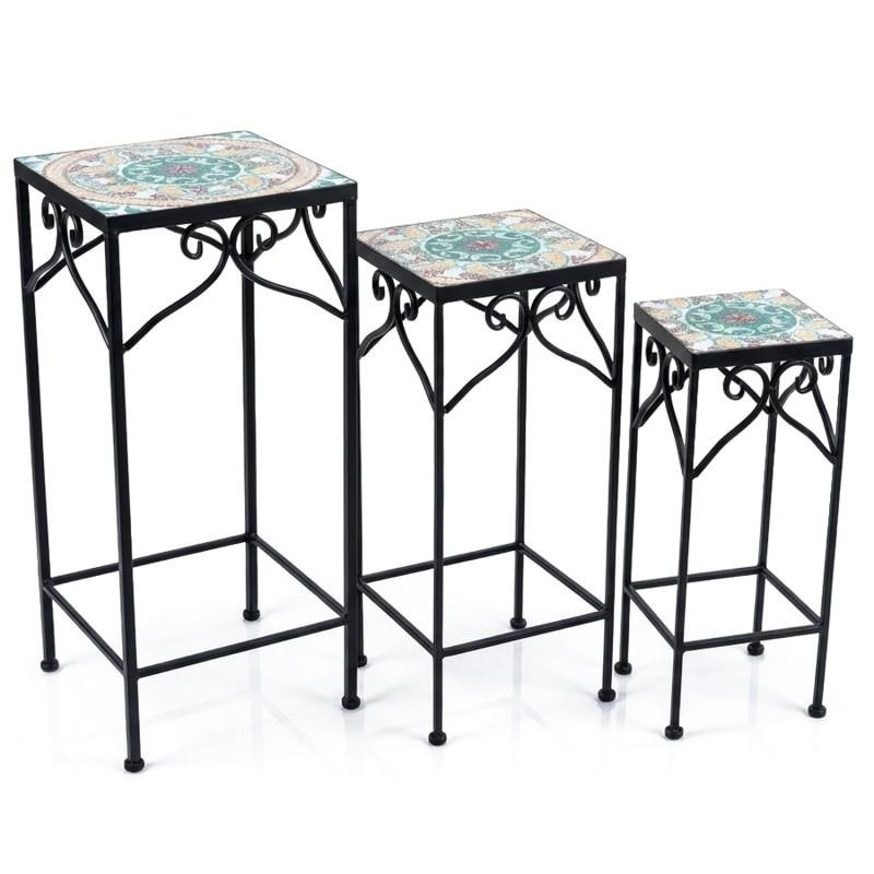 Set de 3 pedestales de metal y piedra en negro, amarillo y rojo. Medidas: 28x28x70, 23x23x60 y 18x18x50cm