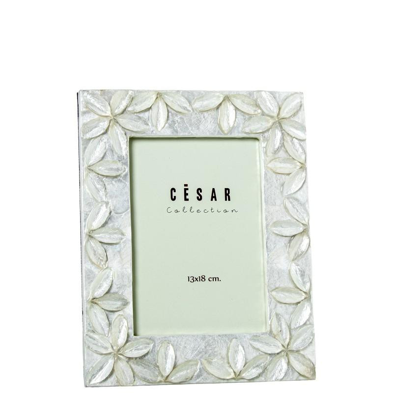 Portafotos de nacar para fotografia de 13x18cm con flores en relieve en natural. Medidas: 19.5x24.5x1cm