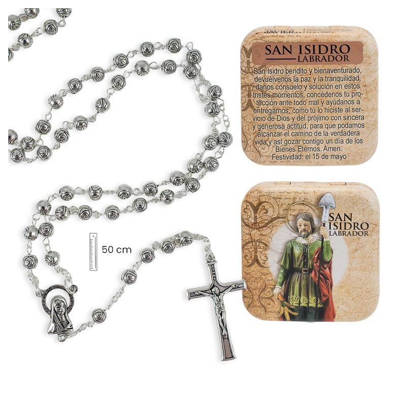 Rosario metal San Isidro Labrador con caja metalica 3x1x50 cm