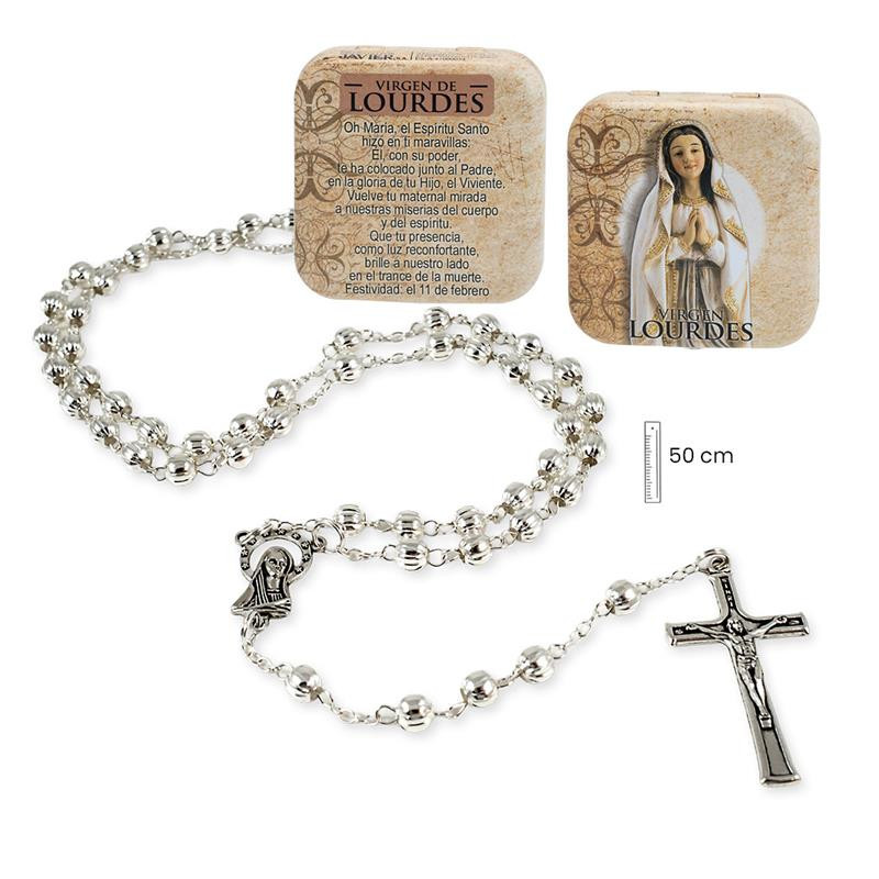 Rosario metal Virgen de Lourdes con caja metalica 3x1x50 cm