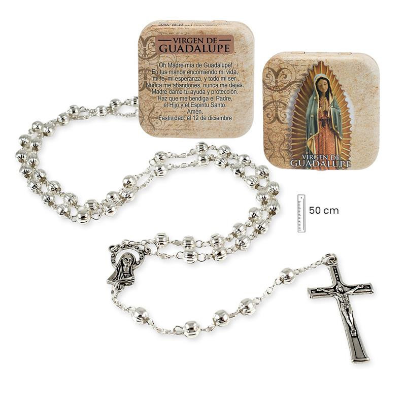 Rosario metal Virgen de Guadalupe con caja metalica. Medidas: 1x50x3 cm