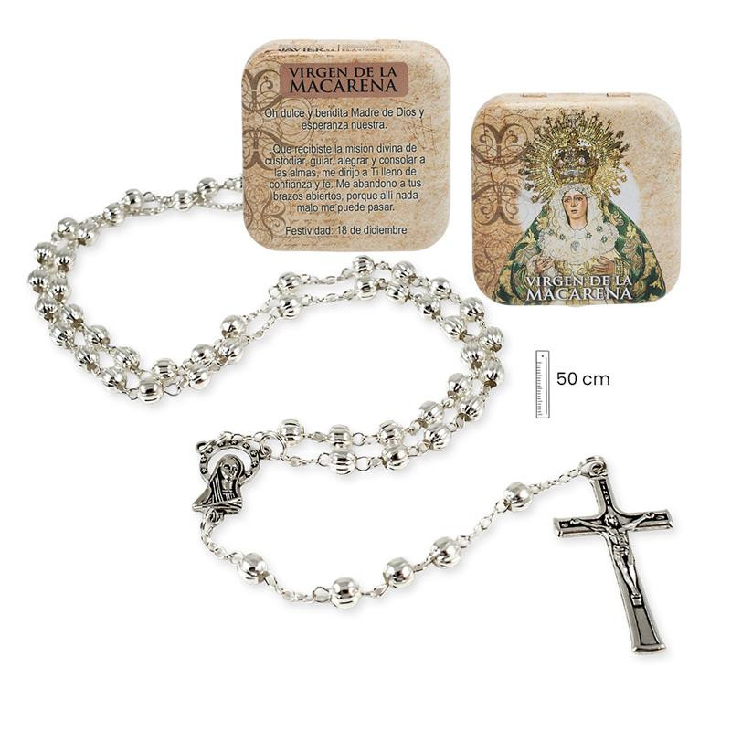 Rosario metal Virgen Macarena con caja metalica 3x1x50 cm