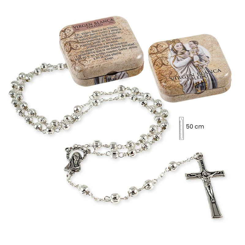 Rosario metal Virgen Blanca con caja metalica 3x1x50 cm