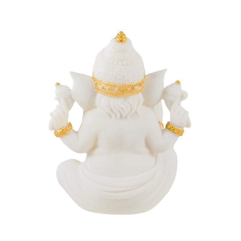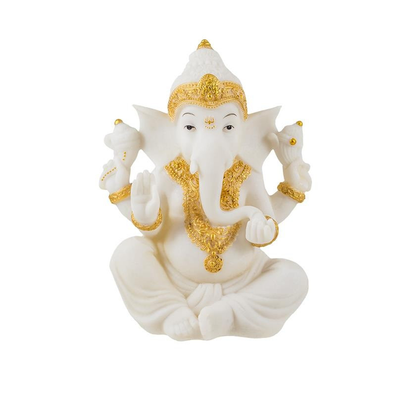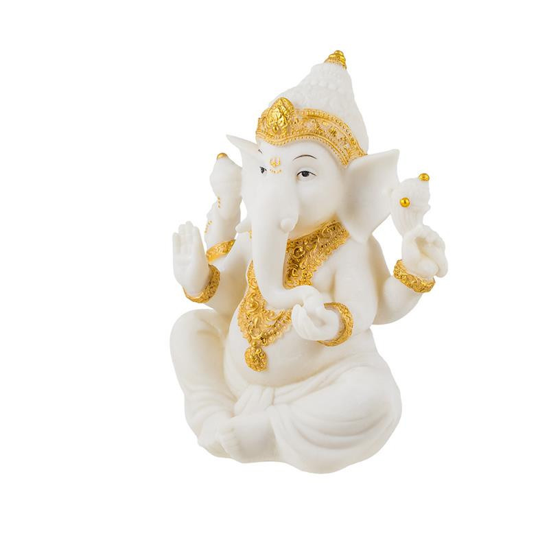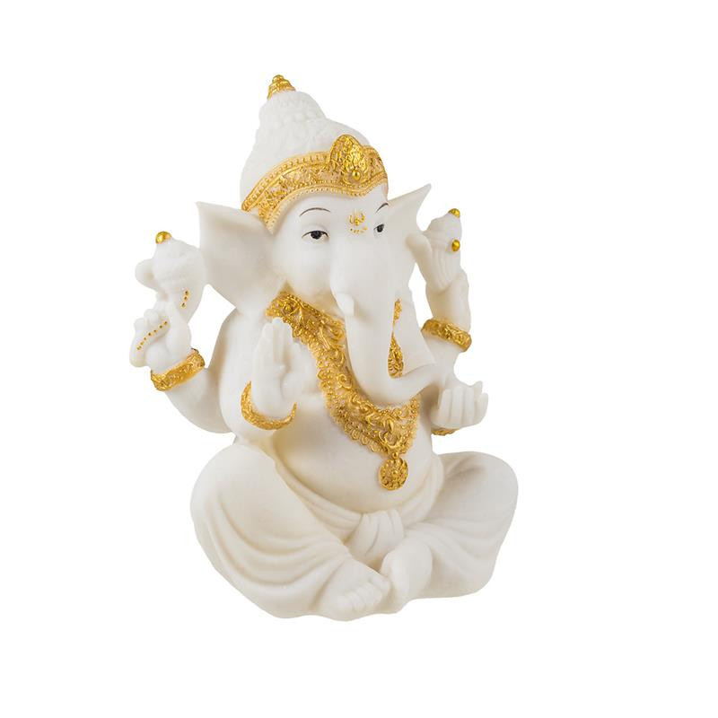 Figura ganesha removedor de obstáculos, patrono de las artes, ciencias y señor de la abundancia blanco y dorado de resina pintado a mano. Medidas: 15 cm