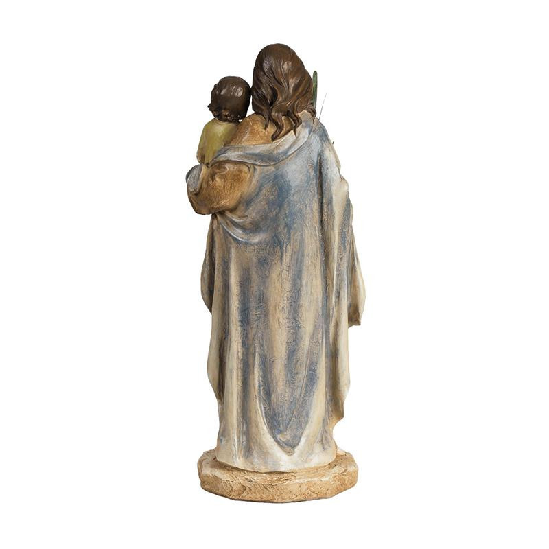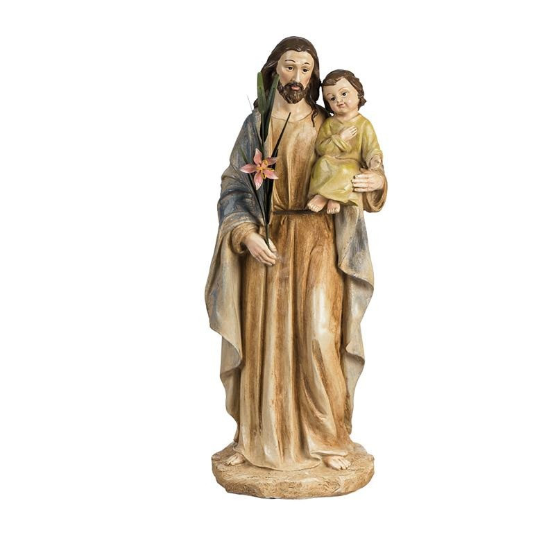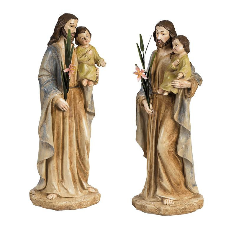 Figura San Jose con el niño de resina pintada a mano en tonos pastel 12x12x46 cm